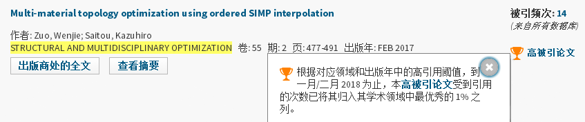 日前,js33333金沙线路检测左文杰教授发表于结构设计领域代表性期刊《Structural and Multidisciplinary Optimization》的论文Multi-material topology optimization using ordered SIMP interpolation入选基本科学指标数据库(Essential Science Indicators,ESI),成为工程技术领域高被引论文,平均引用数(引用数/出版时间)进入学科领域最优的1%之列。