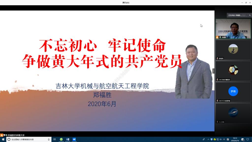 本次党课以“不忘初心,牢记使命,争做黄大年式的共产党员”为主题,重温了《习近平总书记对黄大年同志先进事迹作出重要指示》,讲述了黄大年同志的主要事迹,并对黄大年精神进行了解读,同时传达了《中共吉林大学第十四届委员会第十三次全体会议决议》的相关精神。郑福胜老师从无悔的壮丽人生、卓越的战略视野、真挚的家国情怀以及黄大年同志留下的宝贵精神财富四方面,回顾了黄大年同志的一生。他倡导同学们以黄大年同志为榜样,学习他心有大我、至诚报国的爱国情怀,学习他教书育人、敢为人先的敬业精神,学习他淡泊名利、甘于奉献的高尚情操,把爱国之情、报国之志融入祖国改革发展的伟大事业之中。他强调,学生党员在日常学习工作生活中,更要以身作则,突出表率作用,既有宽广胸怀,又有责任担当。最后,郑老师传达了学校关于毕业生返校的相关要求,希望毕业生党员加强防控意识,按照学校的相关要求,在返校和离校工作中起到先锋模范作用。