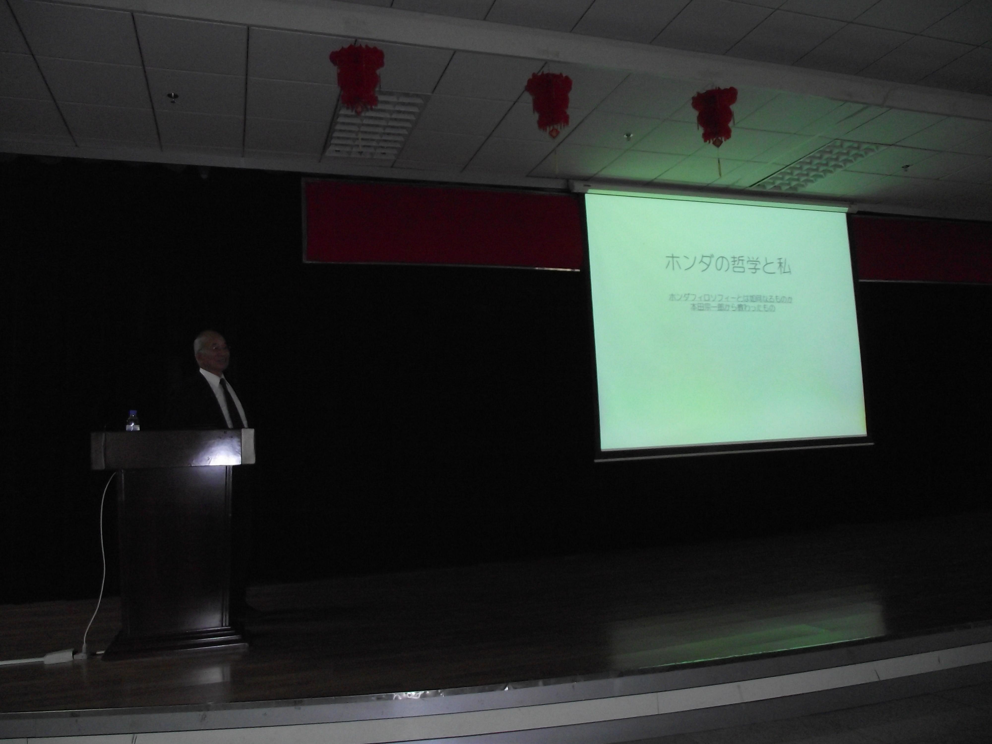 吉村年光先生向在座师生介绍了日本本田公司创始人本田宗一郎提出的关于购买的喜悦、销售的喜悦、创造的喜悦,对人才的自立、平等、信赖的经营理念及运营方针。讲述了自己多年的求学和工作经历,并根据这些经历得出了“创造性的想法来自于中学时代的累积;理论要扎实,不要害怕失败,不懈追求;激活脑细胞;提前预习,保持紧张感”等观点。