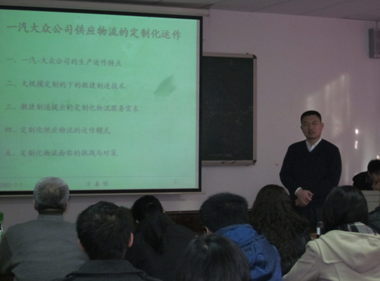 2011年11月20日上午8:30分,长春一汽大众集团有限公司管理培训主管方春明博士受工业工程系主任孔繁森教授的邀请,在南岭校区机械材料馆529室为机械js3333线路检测中心师生做了一场题为《一汽大众公司供应物流的定制化运作》的专题讲座。