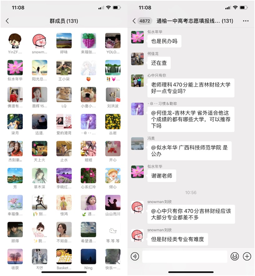 咨询会采用微信群与腾讯会议同步进行的方式展开。在微信群内和腾讯会议中咨询的高三学子和家长络绎不绝,既有咨询专业选择、奖助学金政策、职业规划等内容的考生和家长,也有希望老师帮忙推荐学校和专业的考生和家长,参与高考志愿填报咨询会的老师针对考生和家长们提出的问题一一给予了耐心细致的专业解答。上午的咨询会结束后,微信群中仍有许多家长和考生们向老师不断咨询和提问。老师们针对每个学生的分数和特点提出了具有针对性的意见和建议,这样的咨询直至28日下午报考结束。咨询会结束后,教师们留下了联系方式,以方便考生后续进行进一步的咨询。