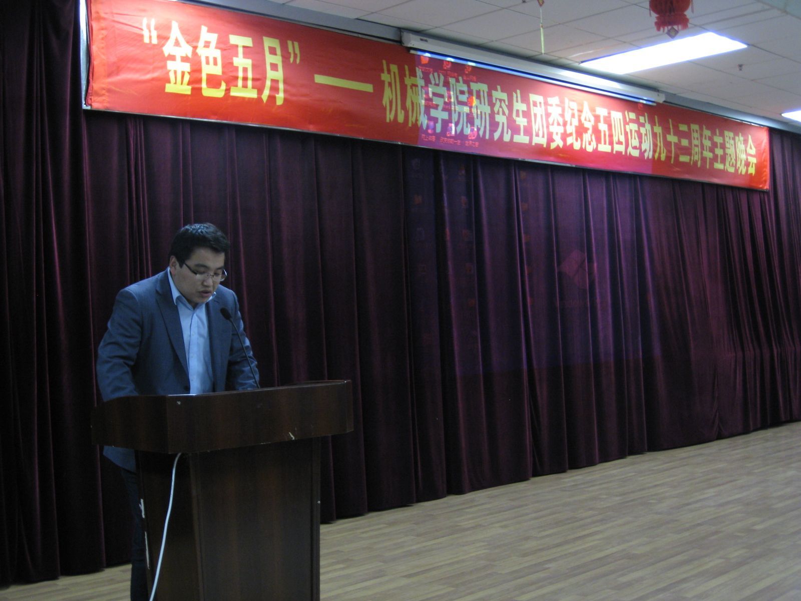 2012年5月4日晚6点30分,由吉林大学机械学院研究生团委主办的“金色五月-机械学院研究生团委纪念五四运动九十三周年暨中国共产主义青年团成立90周年”主题晚会在机械材料馆八楼报告厅隆重举行。机械学院党委副书记郑福胜老师、机械学院研究生办公室巴特老师参加了此次晚会。