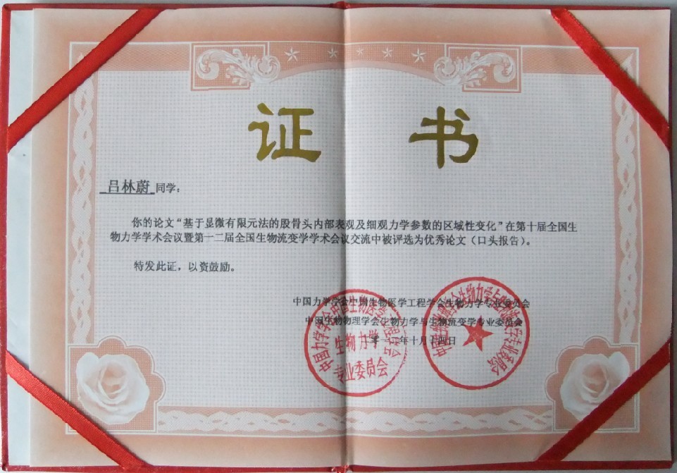 三位参会的博士生同学均获得了我校研究生院“资助研究生参加国内学术交流活动计划”的资助,并在会上做口头报告,其中,吕林蔚同学的口头报告“基于显微有限元法的股骨头内部表观及细观力学参数的区域性变化”,被评选为优秀论文(口头报告),这个奖项是从82名会上做口头报告的研究生中产生10名,涉及分子-细胞生物力学、力学生物学、肌骨正畸生物力学、血流动力学与流变学、宏观生物力学及应用等多领域。