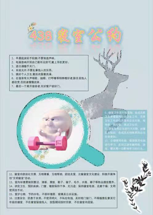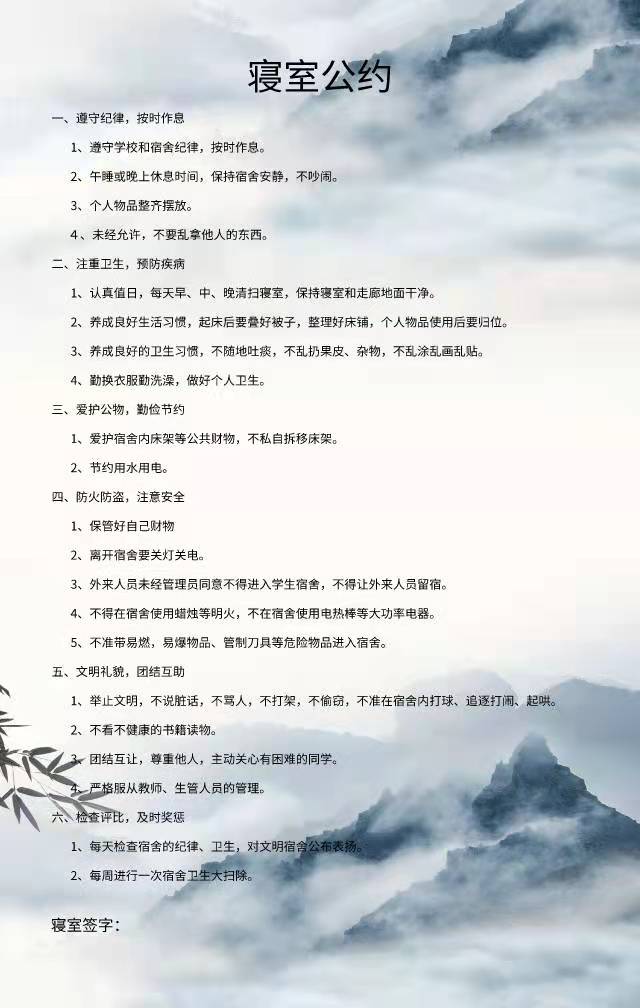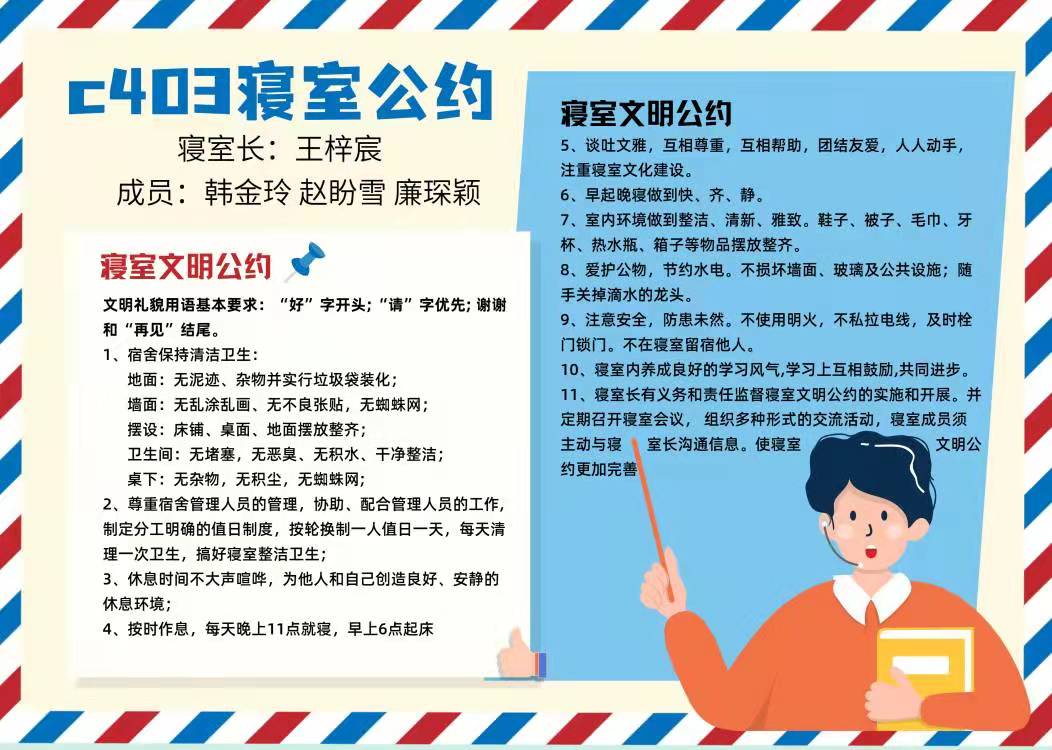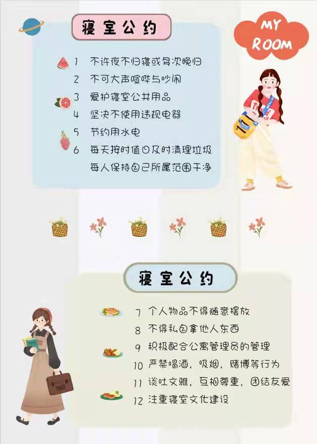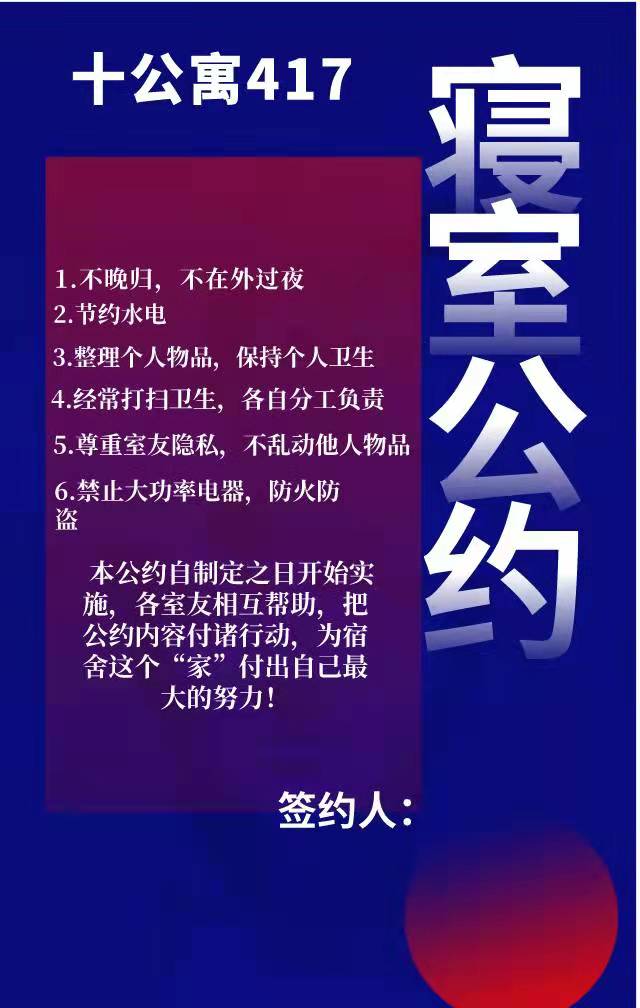 为进一步加强公寓文化建设,发挥公寓育人阵地作用,推动学生寝室制度化、有序化管理,引导学生养成良好的生活习惯,营造文明和谐、干净整洁的寝室文化氛围,js33333金沙线路检测于10月20-25日开展了全员参与创建寝室文明公约活动。寝室公约是寝室共同居住成员在遵守学校规章制度的前提下,就作息时间、值日制度、寝室安全等方面,经友好协商、普遍认可、自主约定形成的公共准则。组织学生签订寝室公约对促进寝室和谐、减少寝室矛盾、增进同学情谊、增强寝室凝聚力具有重要意义。接下来,学院将统一印制文明公约海报,统一张贴在寝室内,全员签约。希望同学们信守公约,共同创造一个“安全、文明、卫生、和谐”的生活环境!