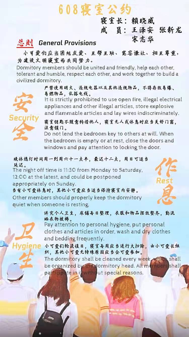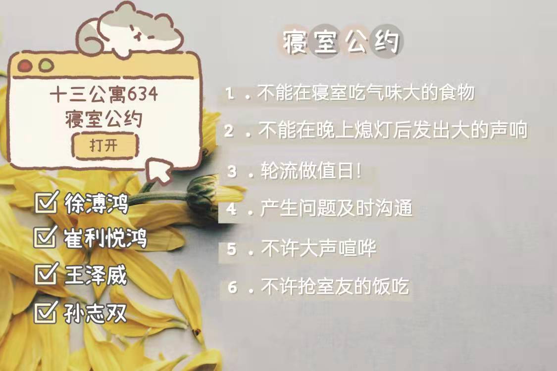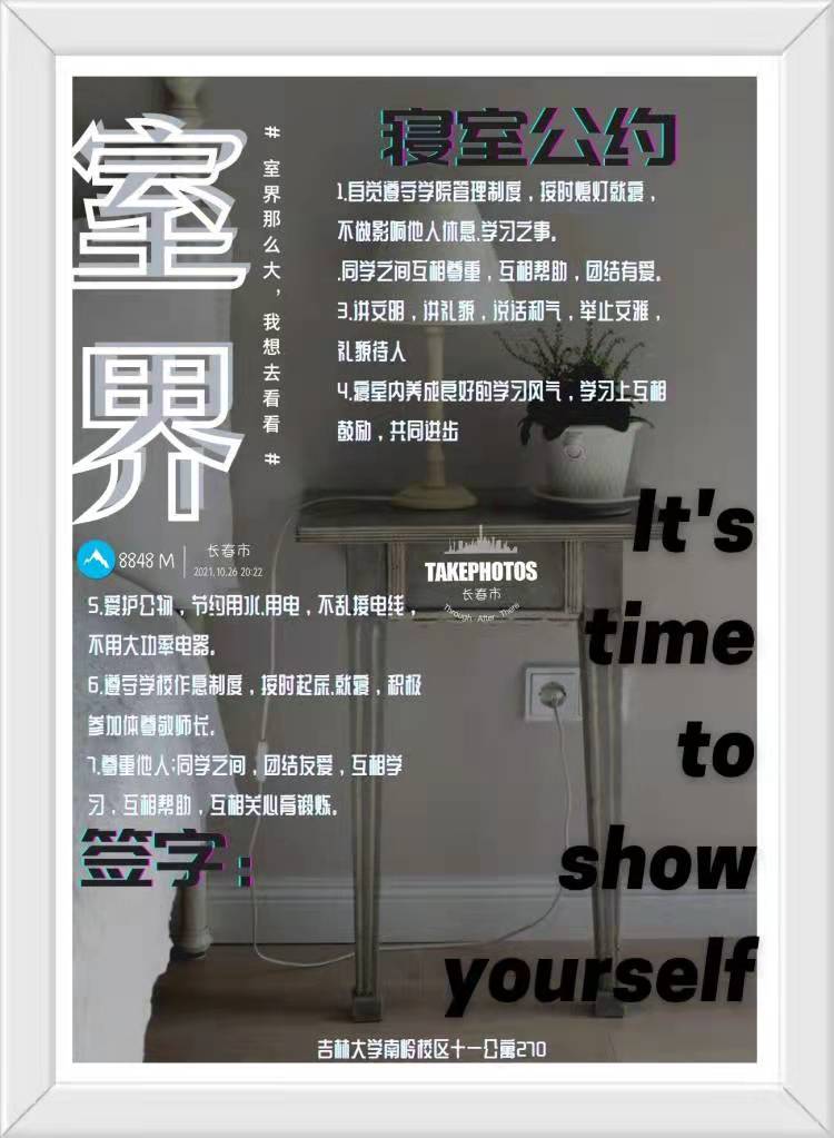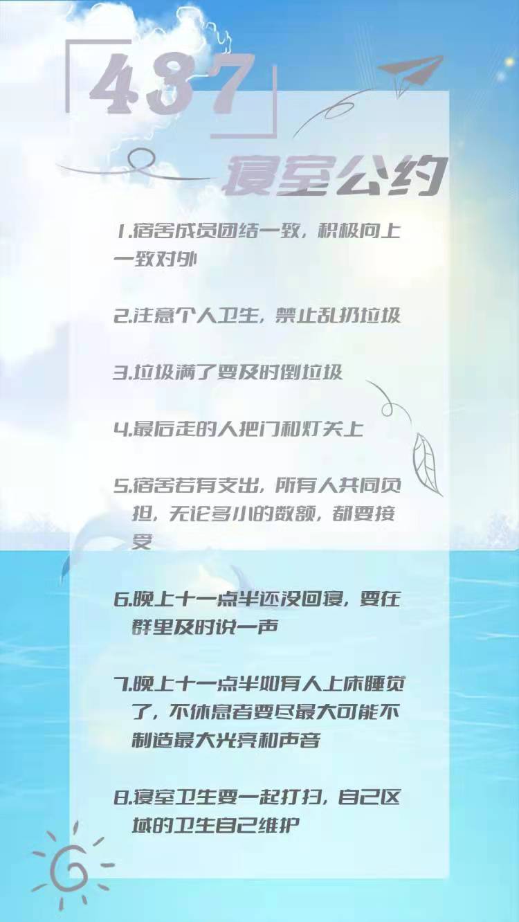 为进一步加强公寓文化建设,发挥公寓育人阵地作用,推动学生寝室制度化、有序化管理,引导学生养成良好的生活习惯,营造文明和谐、干净整洁的寝室文化氛围,js33333金沙线路检测于10月20-25日开展了全员参与创建寝室文明公约活动。寝室公约是寝室共同居住成员在遵守学校规章制度的前提下,就作息时间、值日制度、寝室安全等方面,经友好协商、普遍认可、自主约定形成的公共准则。组织学生签订寝室公约对促进寝室和谐、减少寝室矛盾、增进同学情谊、增强寝室凝聚力具有重要意义。接下来,学院将统一印制文明公约海报,统一张贴在寝室内,全员签约。希望同学们信守公约,共同创造一个“安全、文明、卫生、和谐”的生活环境!