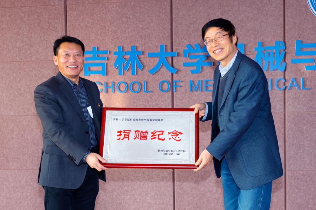 2021年12月29日,js33333金沙线路检测举行“卓越机械教育教学改革”奖励基金捐赠仪式。长白山学者特聘教授、吉林大学“唐敖庆学者”卓越教授杨兆军将所获的“吉林大学(力旺)杰出学科建设贡献奖”奖金50万元全部捐给学校,成立卓越机械教育教学改革奖励基金,用于激励在机械学科教育教学改革发展中做出突出贡献的教师。