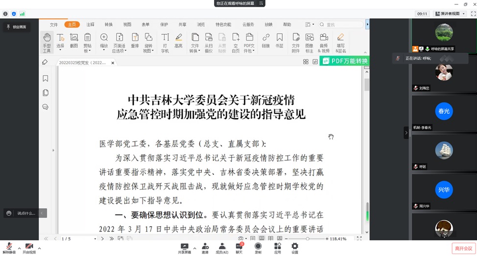首先,呼咏书记带领大家学习了“中共吉林大学委员会关于新冠疫情应急管控时期加强党的建设的指导意见”。“意见”为深入贯彻落实习近平总书记关于新冠疫情防控工作的重要讲话重要指示精神,落实党中央、吉林省委决策部署,坚决打赢疫情防控保卫战歼灭战阻击战提供了指导。会议深度分析了七个“到位”,为开展思想教育、组织覆盖、科学管理以及监督检查等工作提供了具体而明确的指导,指引全体党员干部和师生群众,不畏困难,不计得失,为夺取疫情防控的最终胜利贡献力量。