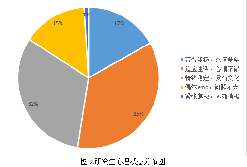 在情绪状况方面,结果如图1所示:27%的同学积极乐观,健康向上;15%的同学心情愉悦,充满活力;28%的情绪稳定,自控力强。总体来说,同学们的情绪质量较高,心态良好,但仍有2%的同学由于学业、家庭、人际交往等原因情绪低落,需要持续重点关注,在必要的情况下对其进行心理疏导。
