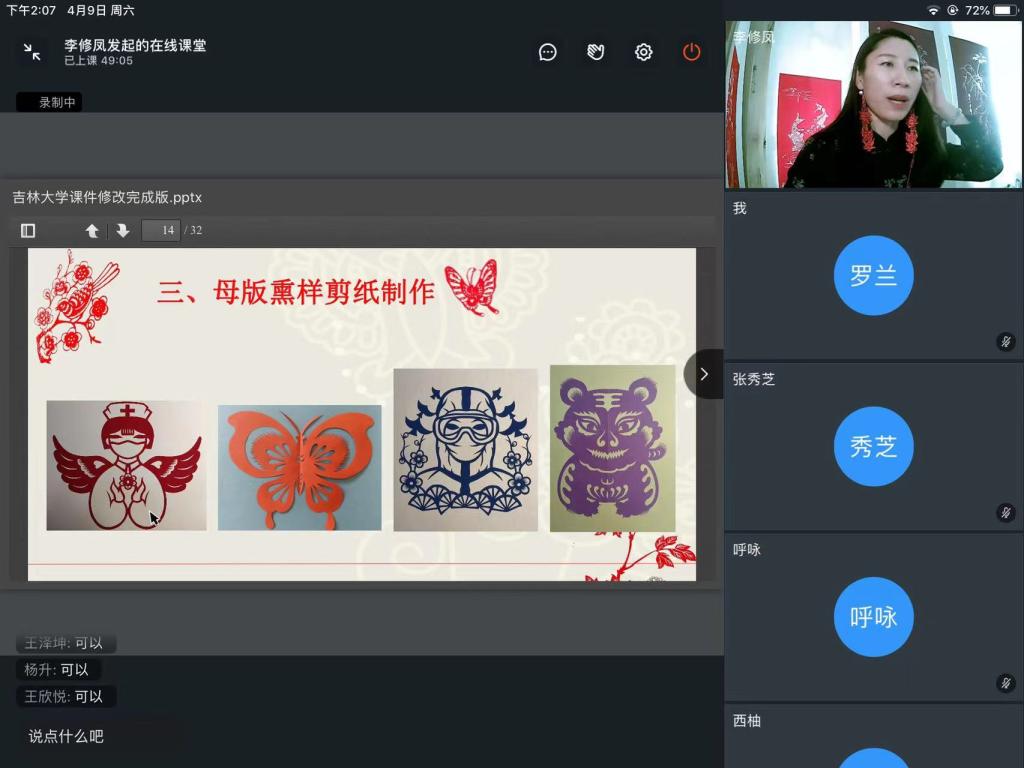为全面贯彻落实学校党委关于疫情防控工作的要求,弘扬中华传统文化,丰富师生的居家生活,表达对春暖花开美好生活的向往,凝心聚力抗击疫情,4月9日下午,js33333金沙线路检测妇委会邀请中国民间文艺家协会李修凤老师,组织线上“巧手抗疫,剪纸祈福”主题剪纸活动。