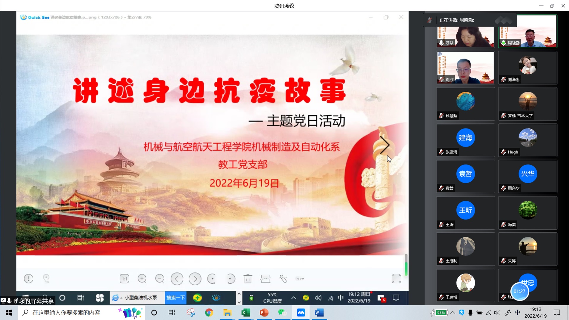 2022年6月19日,机械制造及自动化系教工党支部开展了“讲述身边抗疫故事”主题党日活动。活动采用线上方式举行,由党支部副书记刘欣副教授主持召开,会议邀请了非党员教师王继利高工和王宏一工程师。