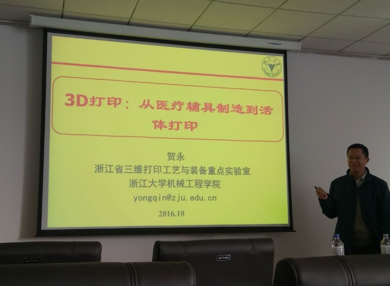 2016年10月24日上午9点,应机械制造及自动化系的邀请,国家自然科学基金优秀青年基金、浙江省杰出青年基金获得者、浙江省三维打印与装备重点实验室副主任、浙江大学机械工程学院博士生导师贺永副教授来js33333金沙线路检测进行访问交流,并为js33333金沙线路检测师生作了一场题为“3D打印:从医疗辅具制造到活体打印”的学术报告。