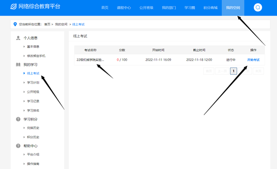 登录进网站后点击“个人中心”进入“我的空间”,查找“我的学习->线上考试”,考试名称为:“22级机械学院实验室安全考试”,点击开始考试进行安全教育考试