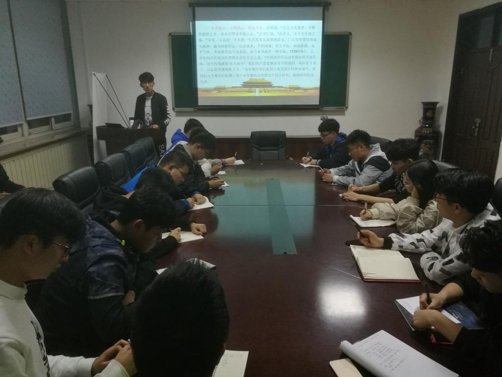 会议的开始,组织处副部长王梓嘉对前段时间团支部工作的开展状况进行了总结,认真分析了各个团支部在工作开展中的优点与不足之处。随后组织处副部长杨弘榕带领团支书认真学习了5月2日习近平总书记在北大120周年校庆师生座谈会上的讲话,重点学习了习近平总书记对青年“爱国”“励志”“求真”“力行”这四点希望,团支书们认真聆听,详细记录,进一步领会到了习近平总书记讲话的深意,明确了青年的社会责任,并且发表了自己的感想。最后杨弘榕对“高举旗帜,学五四,悟民族魂;青春建功,扬风采,创双一流”主题团日活动进行了工作部署,团支书们积极交流想法,认真听取他人意见,各自展现出将本次活动办得更好的信心。到此,本次会议圆满结束。
