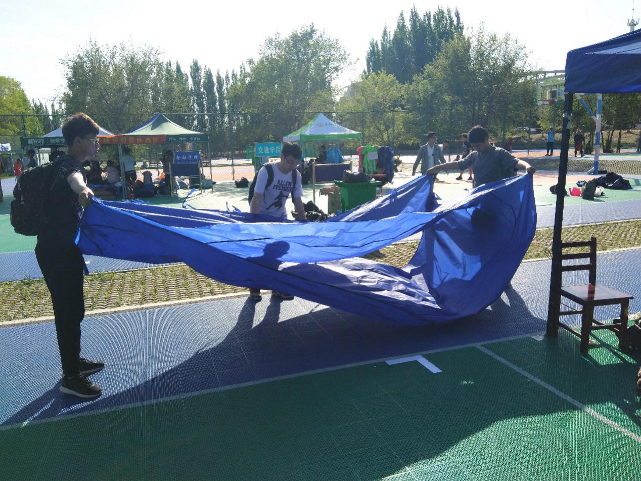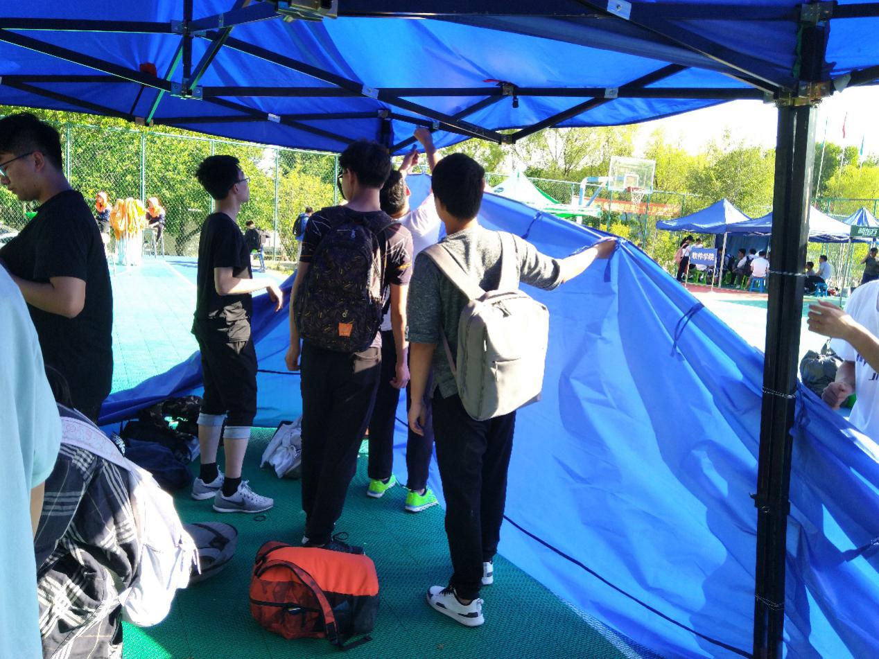 早3:30左右,工作人员抵达中心校区,进行准备工作,选择地点并准备搭建营地的物品。进行人员分组后,每个人都各司其职,开始了搭建工作。随后工作人员赶赴篮球场指定地点,先按遮阳蓬尺寸与营地大小固定遮阳蓬的支架,随后将篷布铺展至其上,完成遮阳蓬的搭建,之后将海绵垫拼接起来铺至大本营的地上,为运动员及工作人员提供坐处,接着又在大本营旁搭建了一个帐篷,用以储放物品及人员休息,同时又搬来桌椅,设置了招待处,并在其旁将机械科学与工程学院院牌立好,最后大家将之后活动所需的十余箱矿泉水等物资搬至大本营,大本营搭建工作在大家的欢声笑语中结束结束。