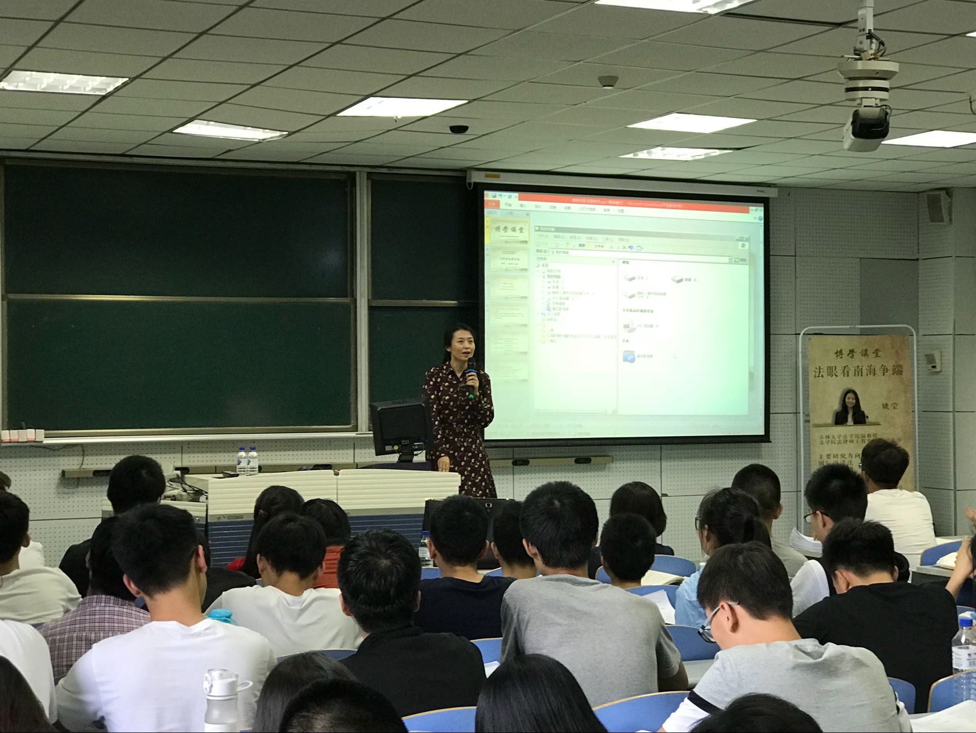 姚莹教授首先围绕近年来备受关注的南海争端问题,从中国、东南亚各国和《国际法》等不同角度阐述了南海争端的原因和其核心问题,接着,从法学的角度分析了与南海问题紧密相关的“南海仲裁案”,指出了南海仲裁案纠纷的实质并对其做出了简要评价。姚莹教授的讲授严谨科学而又不失幽默风趣,用浅显易懂的语言巧妙阐释了专业艰深的法学理论,同时,讲授不仅仅限于理论层面上的分析,还穿插了姚莹教授在研究过程中的经历和心得。讲授的过程中,学生认真听讲,积极思考,会场不时爆发出热烈的掌声和轻松的笑声。在讲座的最后,姚莹教授简明扼要地分析了中国针对南海问题的坚定立场和各方面的行动,并再度强调了中国对南海不容置疑的主权。