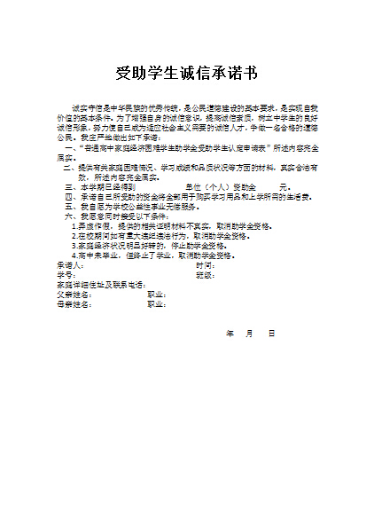 说在口上是一言九鼎,写在纸上乃一诺千金。作为一种承诺形式,签写诚信承诺书能在学生心中形成一种无形的约束力。在这种约束力下,学生能更自觉地履行义务、承担责任,从而能够有效地避免助学贷款政策在落实的过程中所遇到的问题,积极促进助学贷款工作健康持续发展。此外,学院组织受资助学生签写诚信承诺书,不仅贯彻落实了教育部办公厅《关于开展高校学生资助诚信教育主题活动的通知》文件精神,同时也为构建“以诚信为荣”的校园文化氛围打下坚实的基础。